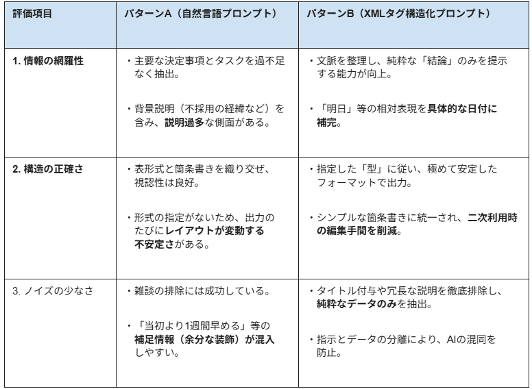 出力の純度 : XMLタグで指示とデータを分離した結果、AIが「指示文の内容」と「議事録の内容」を混同することなく、ターゲットとなる情報のみを抽出できています。