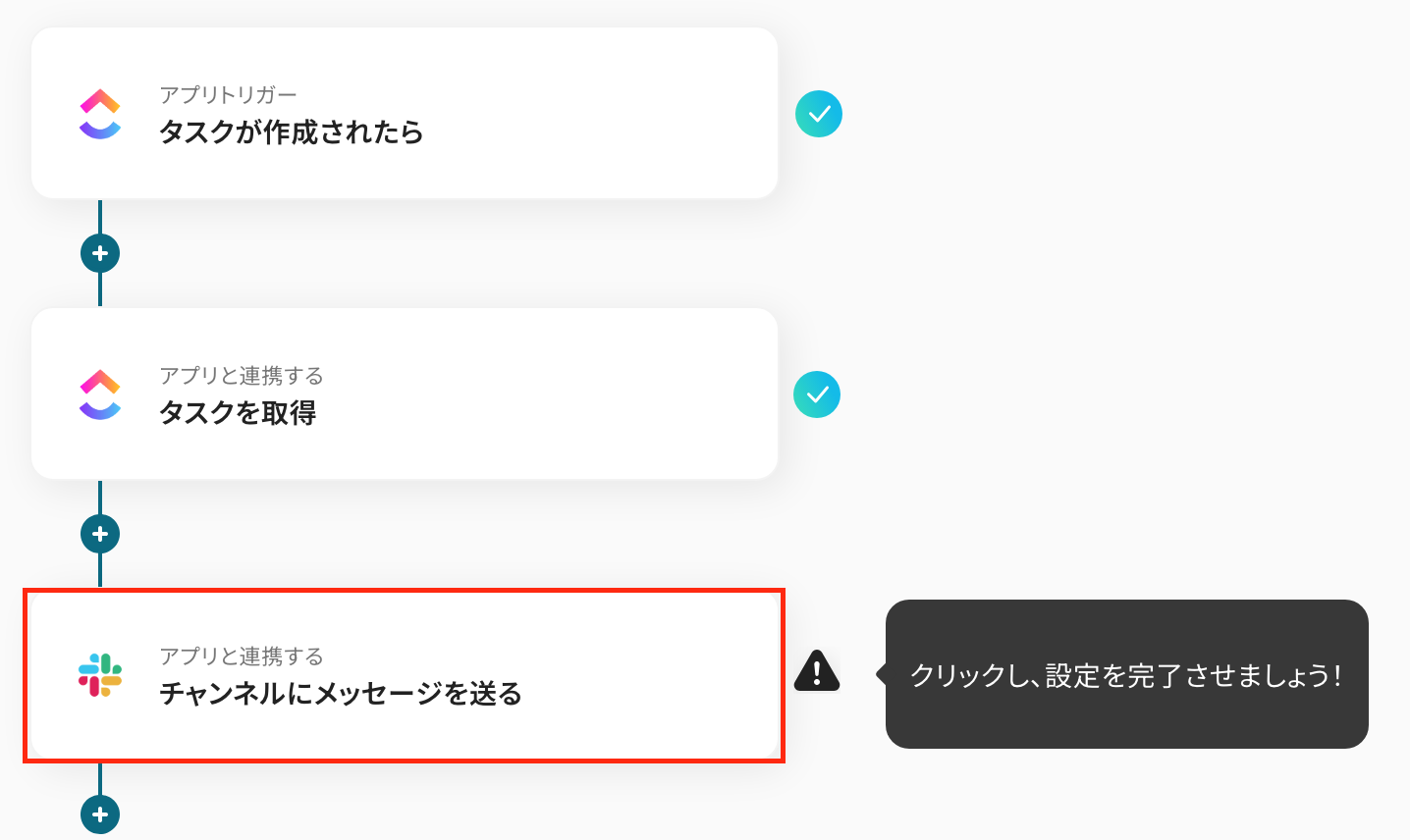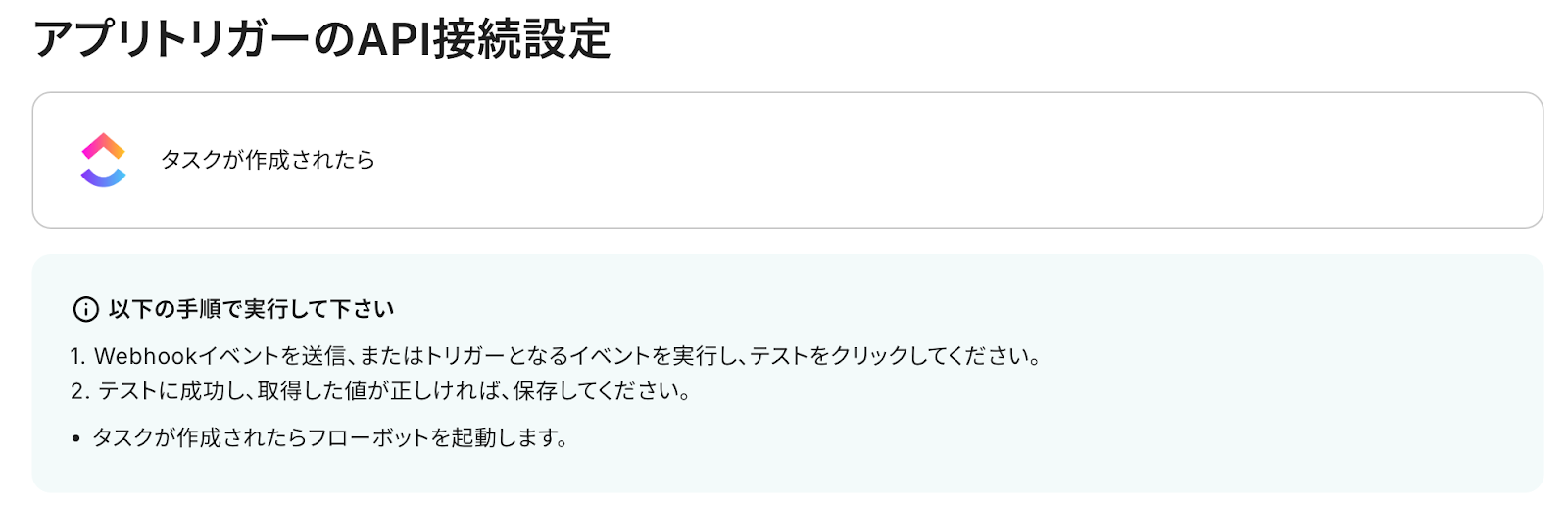 最初の設定です!ここからは「ClickUpでタスクが作成されたらSlackに通知する」フローボットを設定していきます。