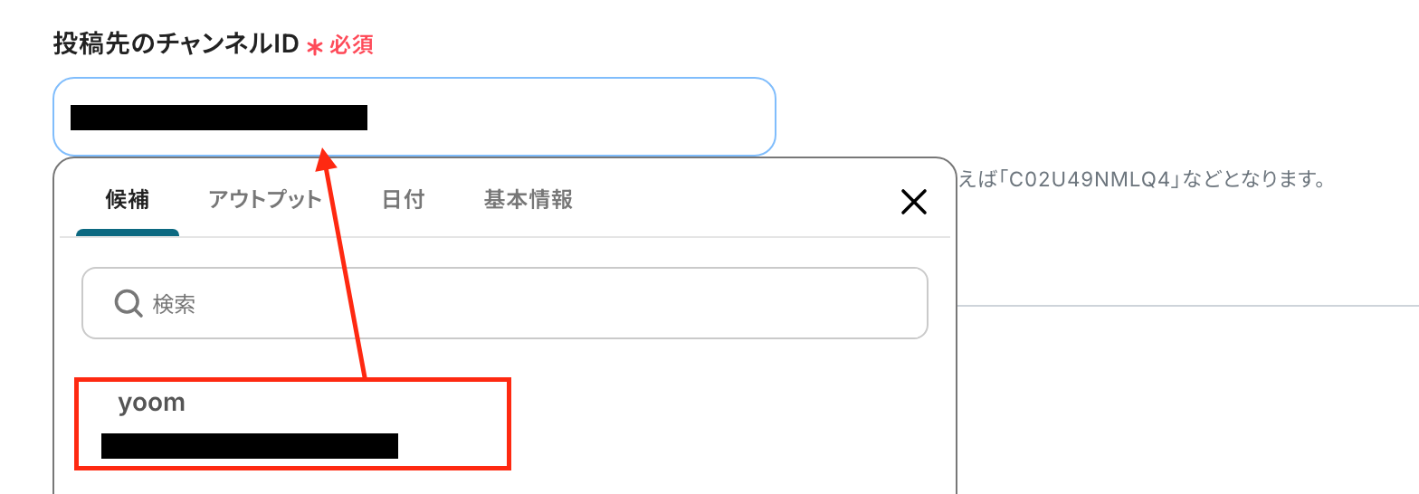 「投稿先のチャンネルID」は、入力欄をクリックして表示される候補から選択しましょう。