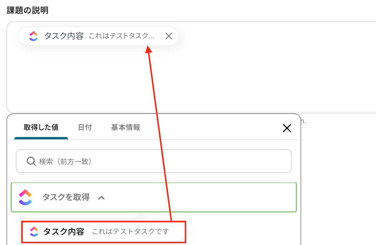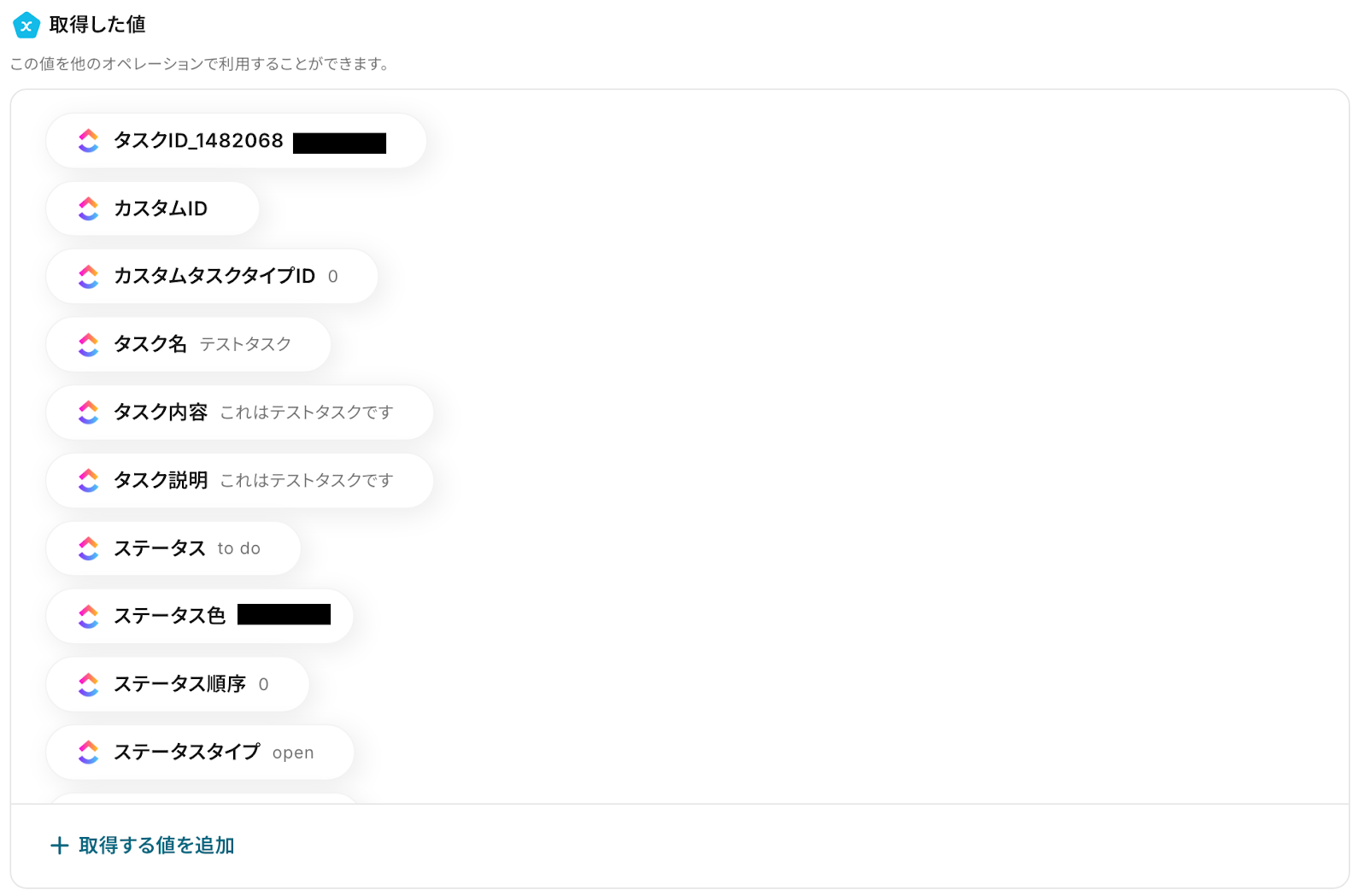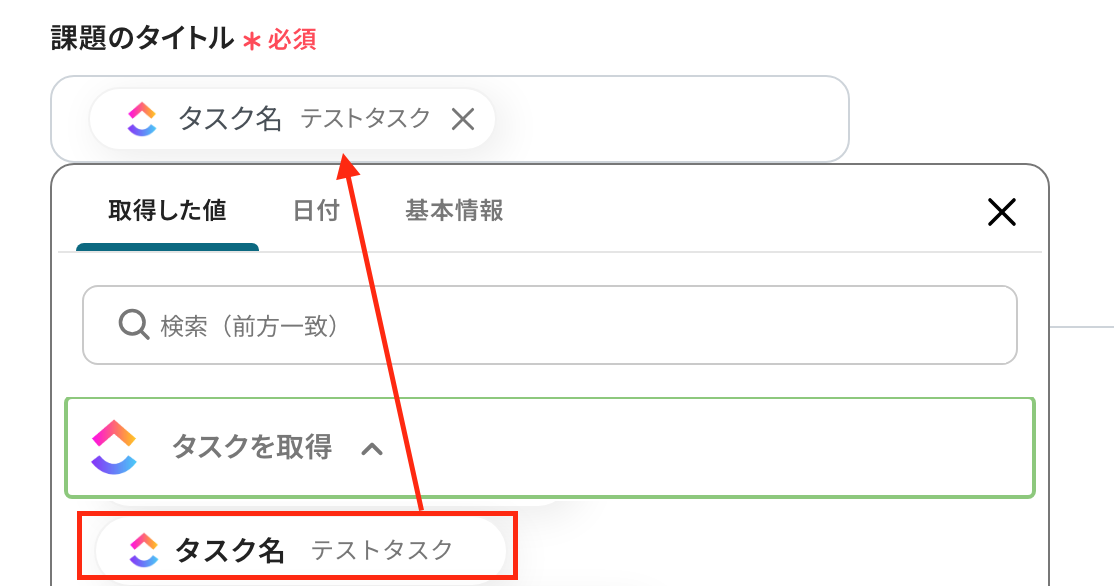 【Tips】 このようにアウトプットを活用することで、ClickUpに新しいタスクが作成される度に最新のデータに基づいてフローが起動し、GitLabに最新データを登録可能となります。アウトプットを活用せず設定を行うと毎回同じタスクデータが追加されてしまうため注意が必要です。