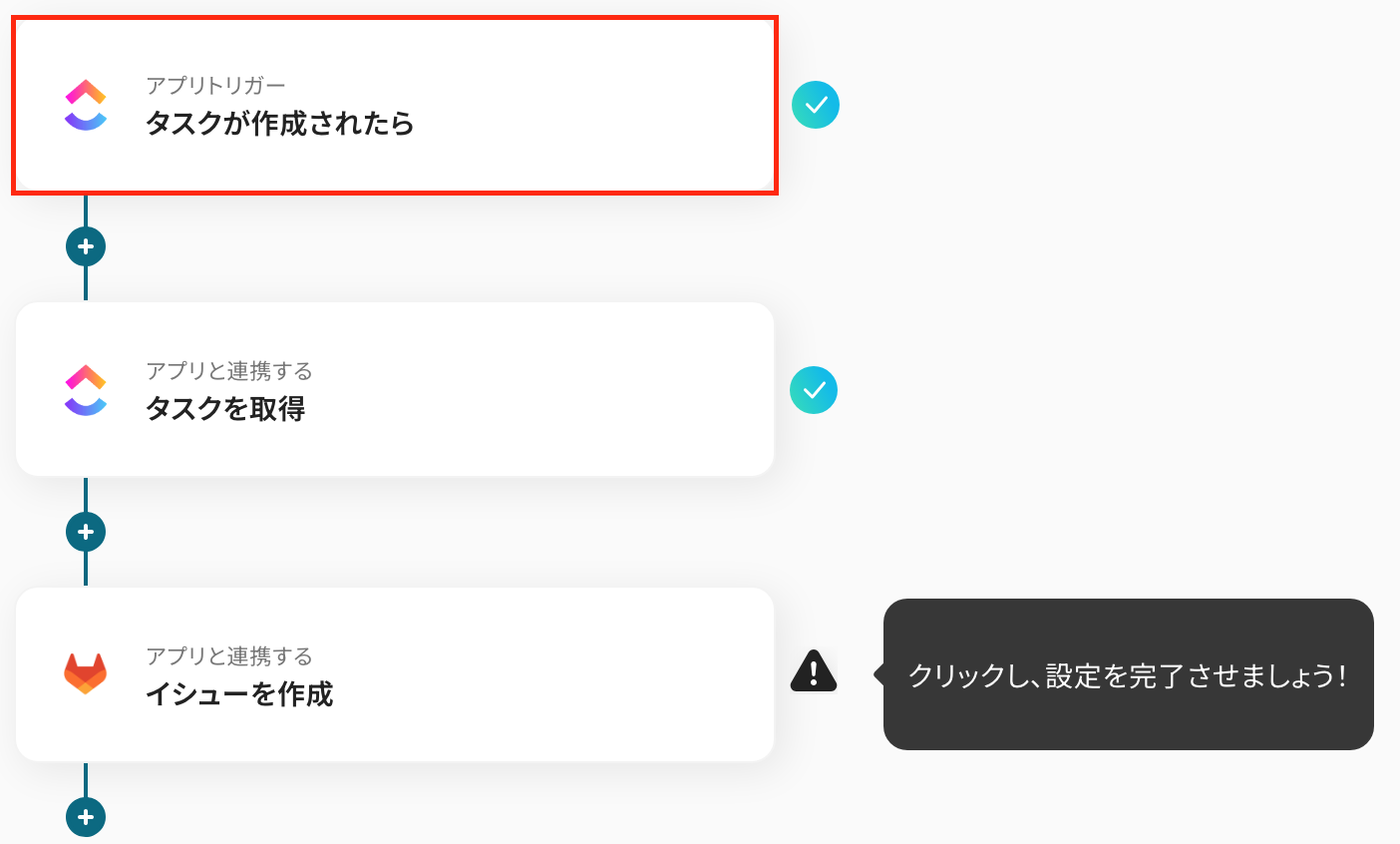 最初の設定です! ここからは「ClickUpでタスクが作成されたら、GitLabにイシューを作成する」 フローボットを設定していきます。以下の赤枠をクリックしてください。