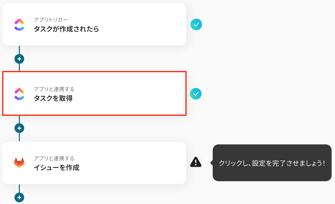 次に、ClickUpのタスクを取得する設定を行います。 赤枠部分をクリックしましょう!