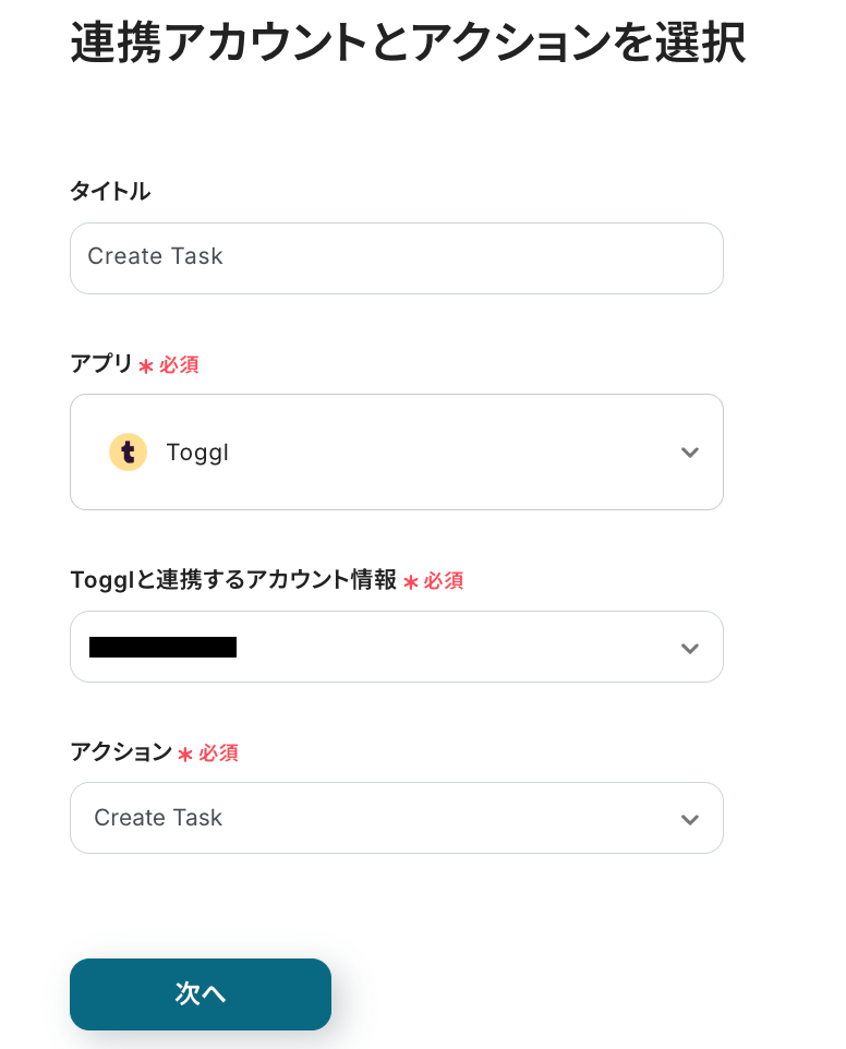 連携アカウントとアクションを選択する設定はこれまでと同じ要領で確認し、アクションは「Create Task」のままにして「次へ」を押します。