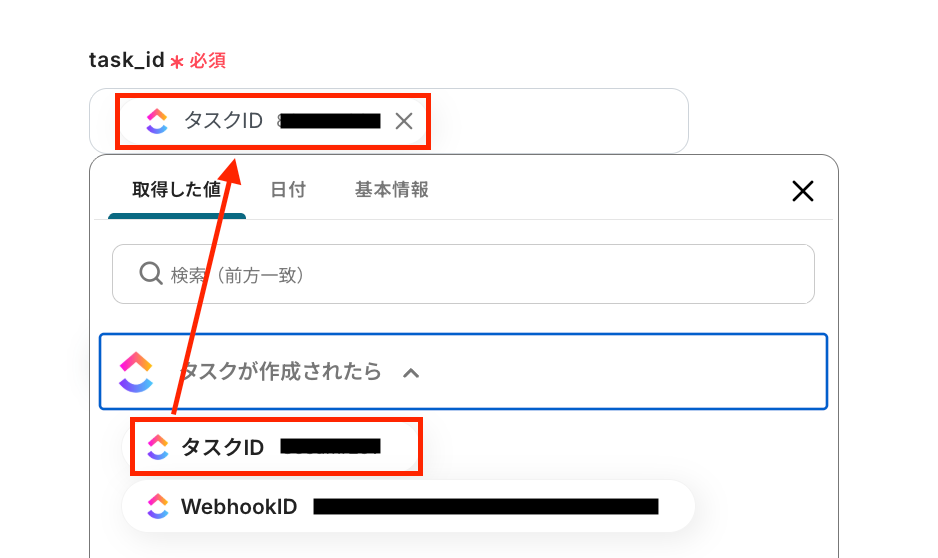 次に、「task_id」を下図のように取得した値を使って設定します。