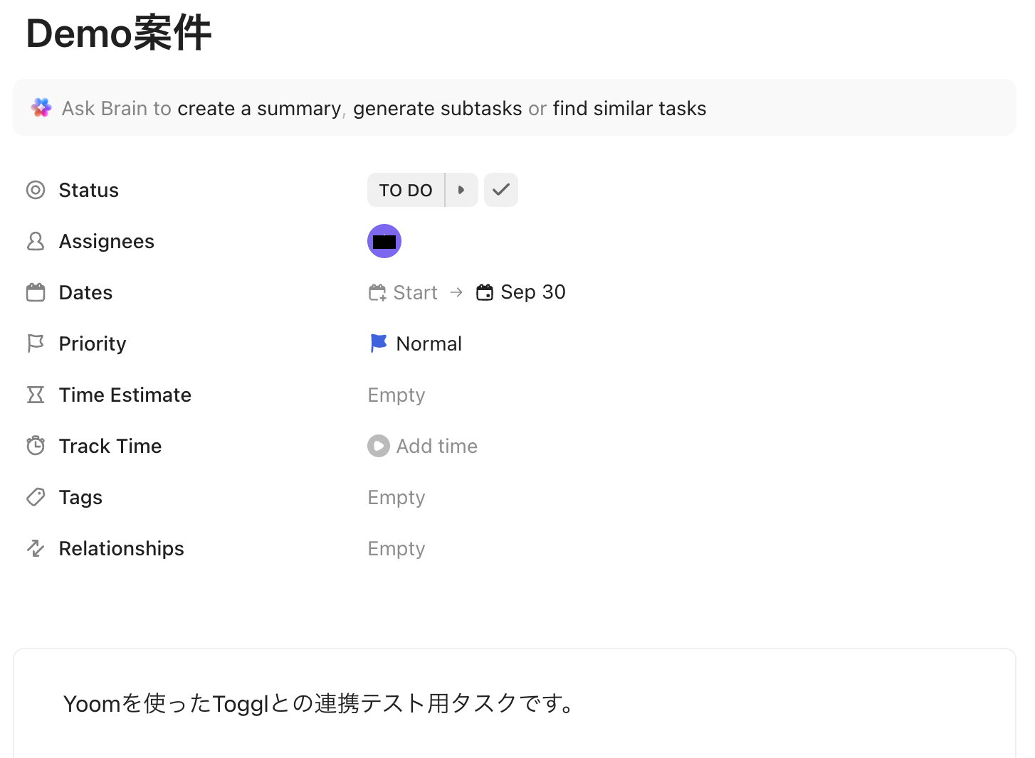 テストなので「テスト案件」や「Demoタスク」など、架空の内容でOKです!