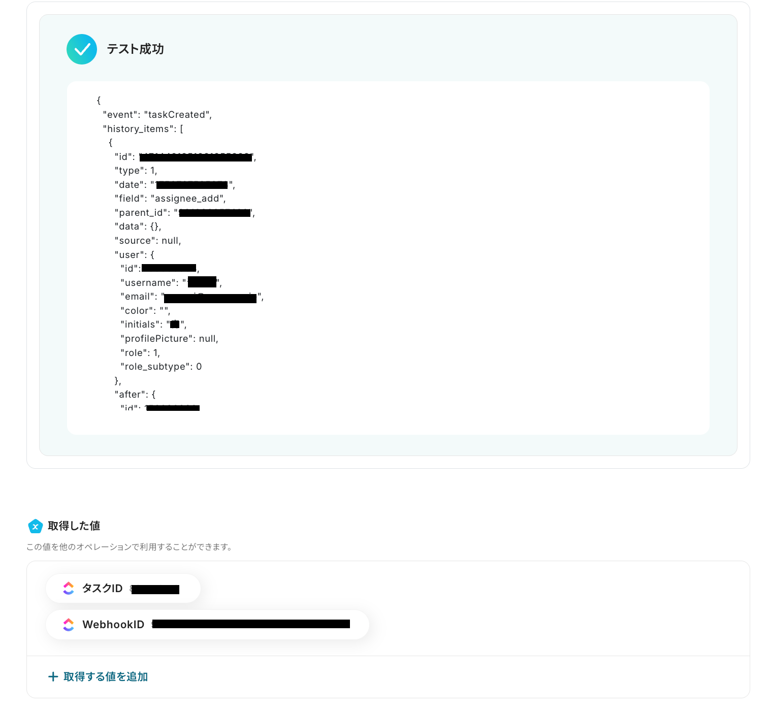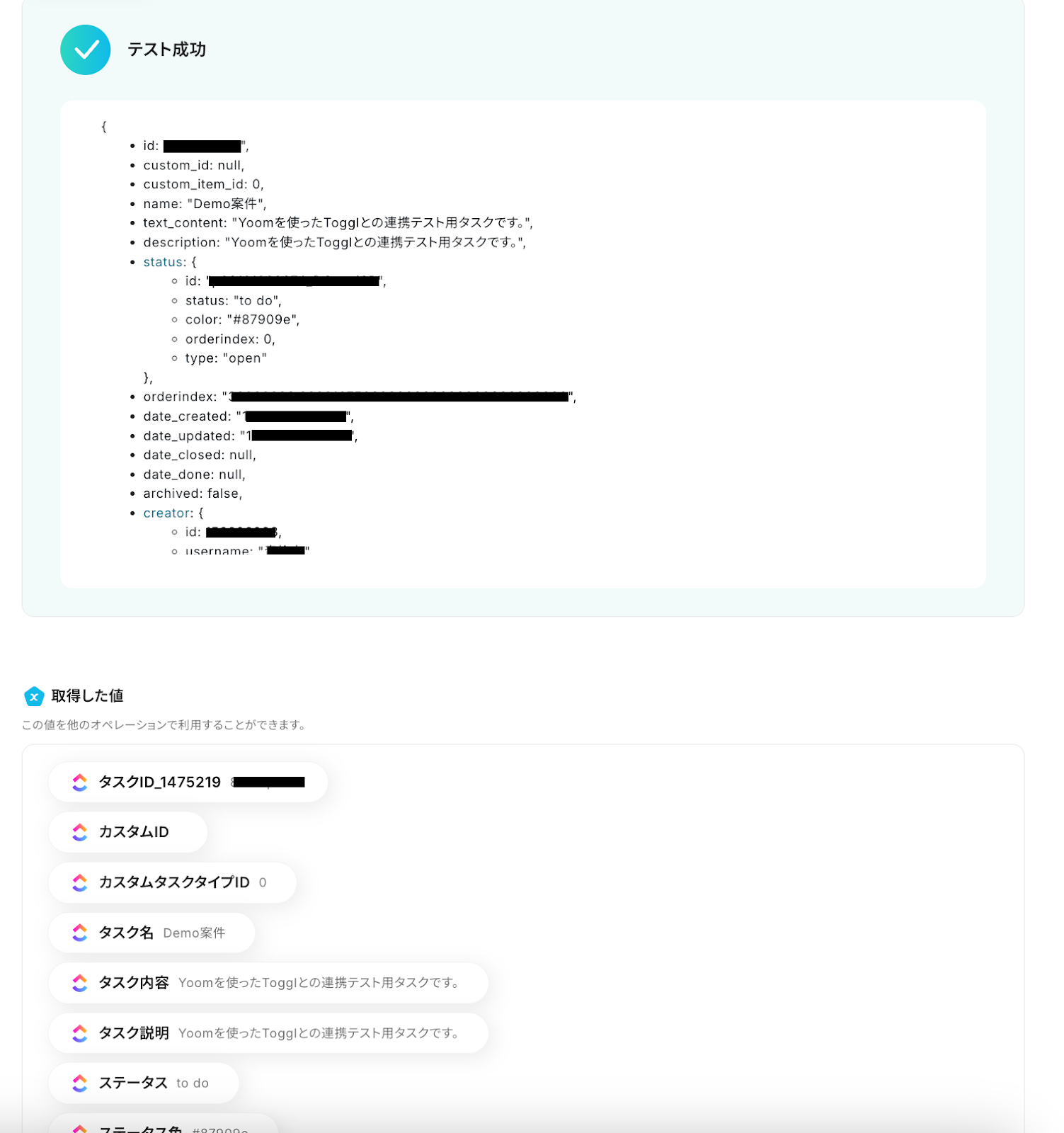 設定が完了したら「テスト」をクリックし、ステップ3で作成したタスクの詳細情報が「取得した値」に抽出されることを確認しましょう。