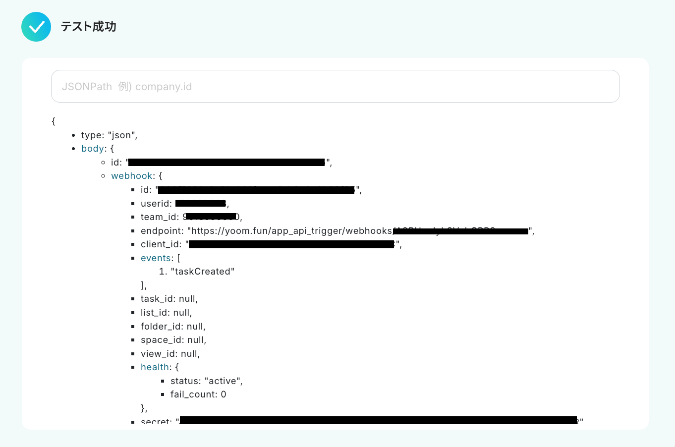 設定が完了したら、ClickUpとYoomの連携チェックを行います。