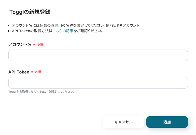下図の画面に遷移するので「アカウント名」は任意の値で入力し、「API Token」はTogglのこちらのページから値を取得して入力しましょう。