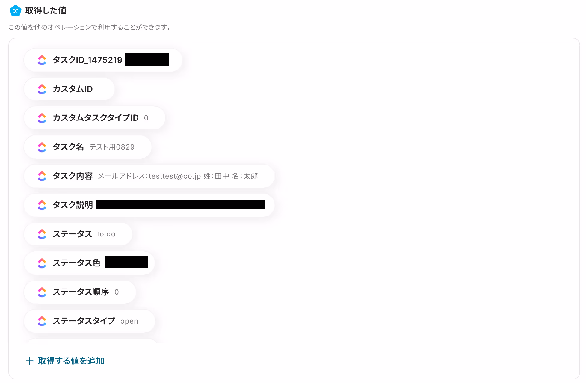 「task_id」は入力欄をクリックし、先ほど取得した値であるアウトプットを活用しましょう。