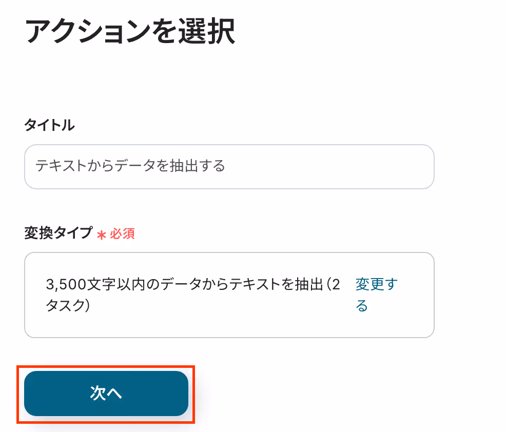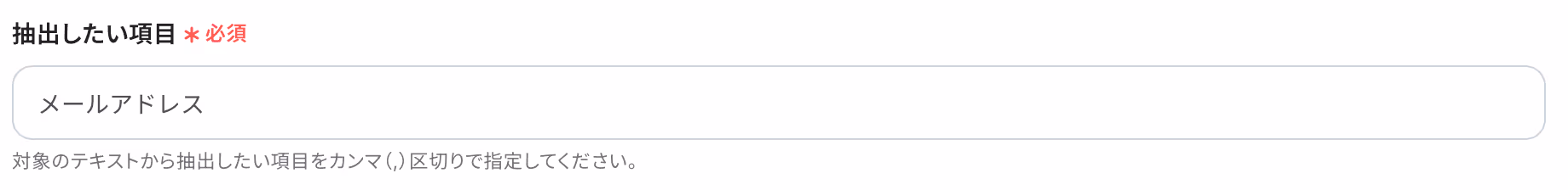 ここでは、対象のテキストから抽出したい項目をカンマ(,)で区切り、指定します。今回はメールアドレスを抽出するため、以下のように入力しました。