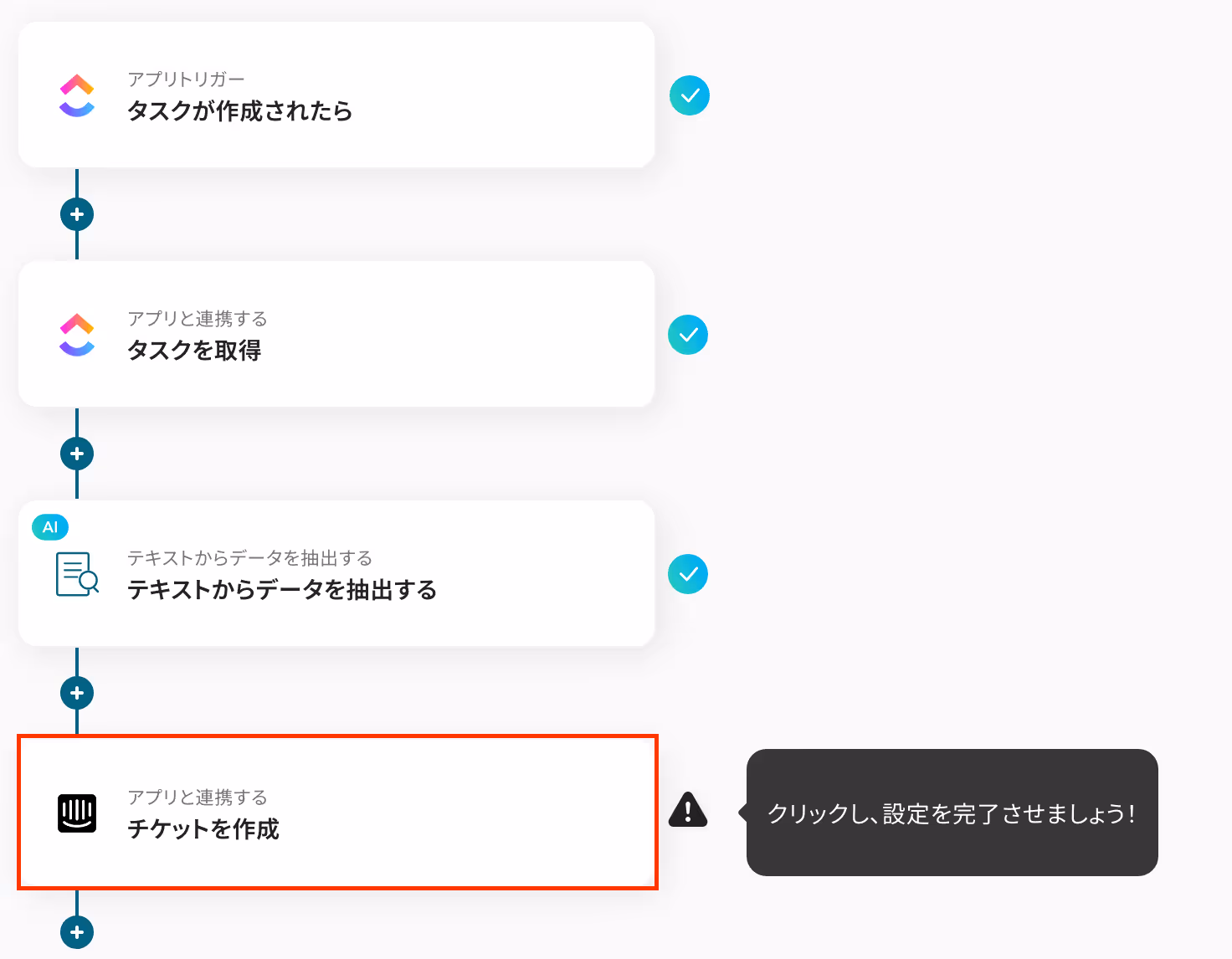 例えば、ClickUpのタスク情報を基にIntercomのチケットを自動で作成したり、特定の条件に合致するタスクのみを連携させたりと、柔軟な自動化が実現できます。