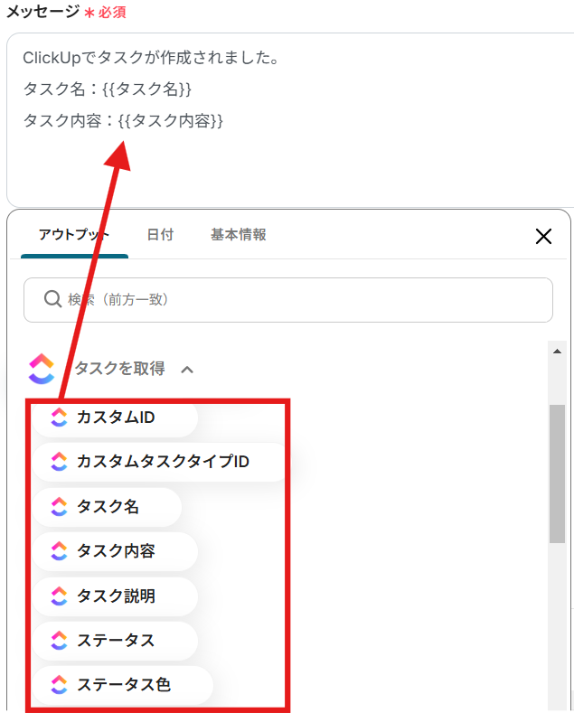 「タスクを取得」のアウトプットからSlackに表示させたいタスク情報を選択しましょう。