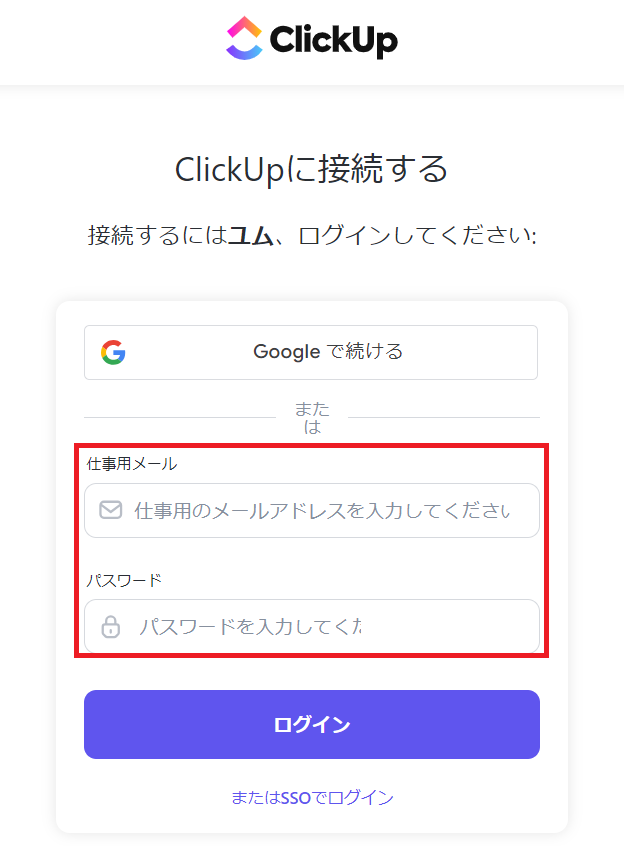以下の画面が表示されたら、ClickUpにログインしてください。