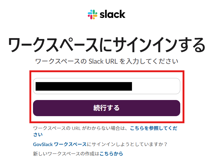 以下の画面が表示されたら、Slack URLを入力してください。