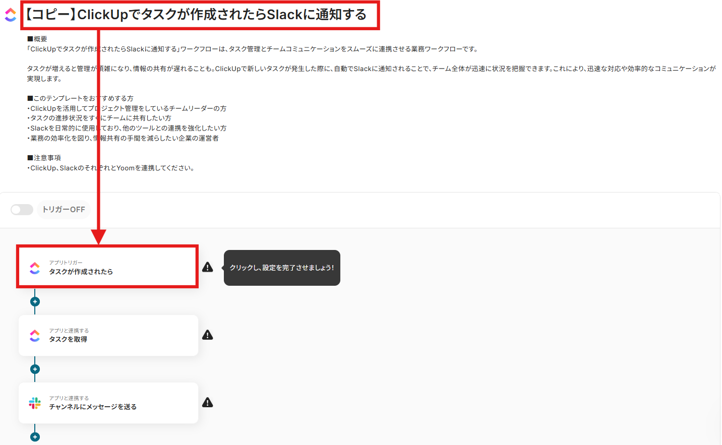 先ほどはClickUpからSlackへデータを連携する方法をご紹介しましたが、反対にSlackからClickUpへのデータ連携を実施したい場合は、下記のテンプレートをご利用ください。