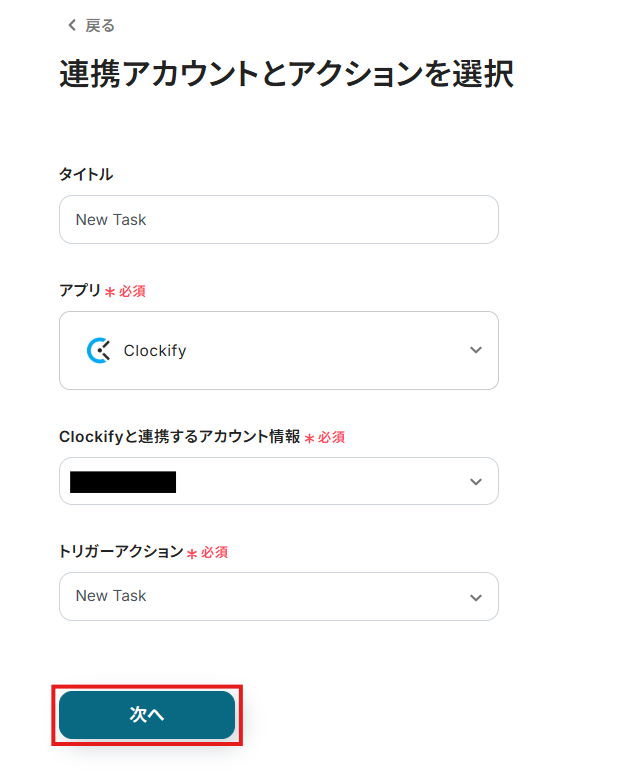 連携するアカウント情報には、ステップ1で連携したアカウント情報が反映されています。トリガーアクションはそのままにして、「次へ」をクリックしてください。
