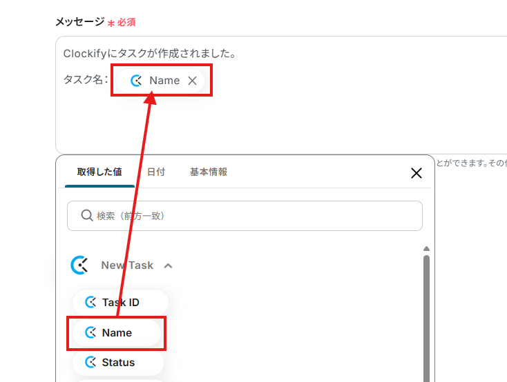 「メッセージ」は、入力欄をクリックして表示される取得した値から選択できます。