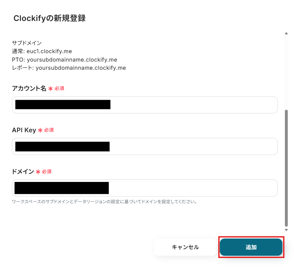 Yoomのマイアプリ連携画面から「Clockify」を選択し、画面の案内に従ってClockifyアカウントで発行したAPIキーなどを入力するだけで、連携はすぐに完了します。