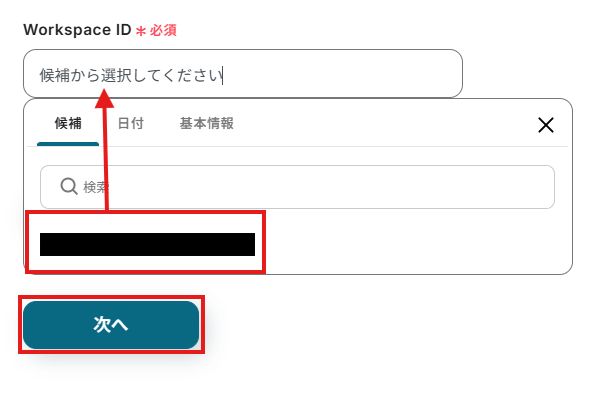 3.「Workspace ID」は、入力欄をクリックして表示される候補から選択してください。