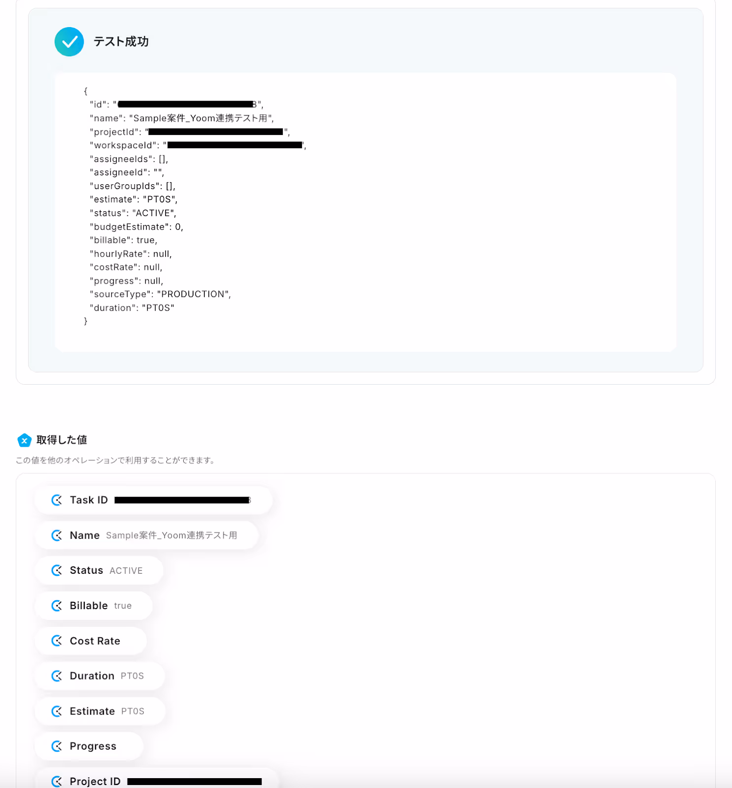 テストが成功すると、先ほど作成したタスクの情報が「取得した値」にアウトプットとして抽出されるので、内容を確認しましょう。