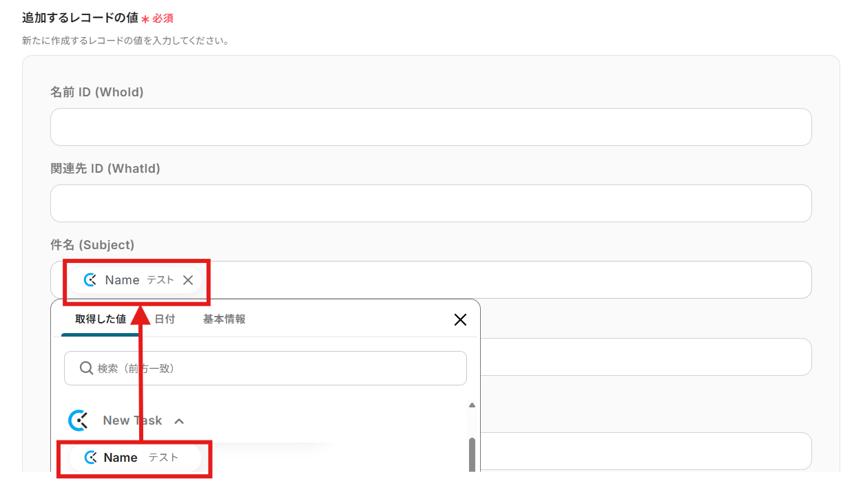 「追加するレコードの値」を設定します。任意の項目を設定してください。