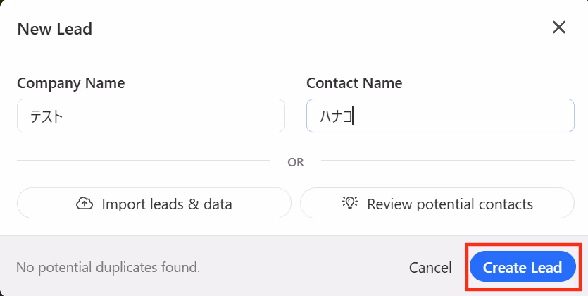 タスクのみ作成することができない場合、一度「Lead」の「+」をクリックし、Leadを作成します。