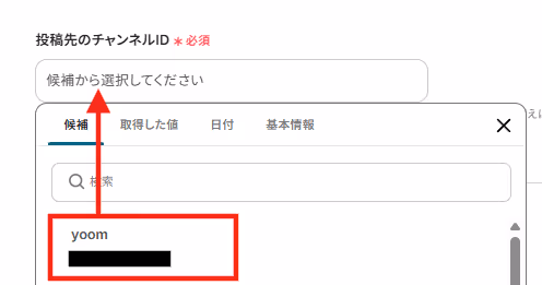 投稿先のチャンネルIDは以下のように表示される候補から選択しましょう。