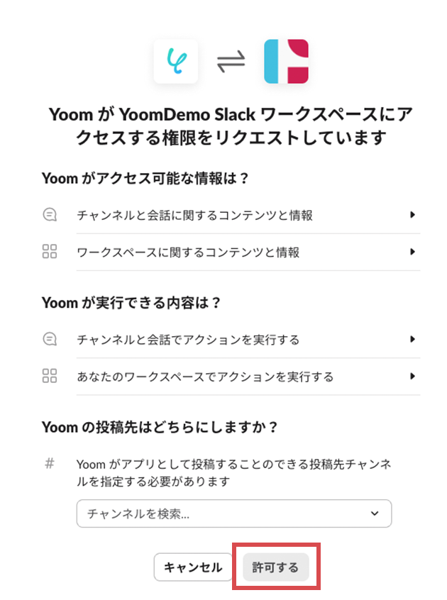 2.YoomからSlackのアクセス許可リクエスト画面に移ります。