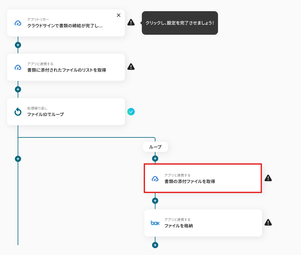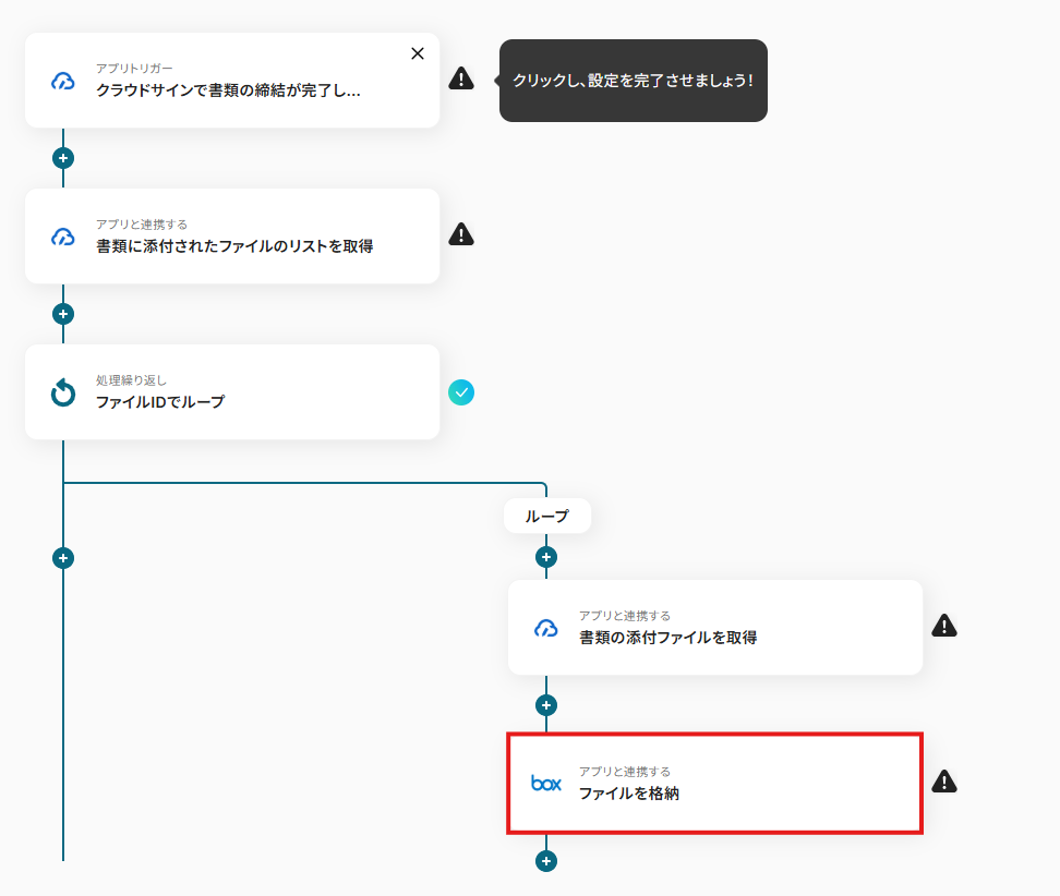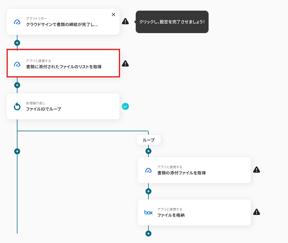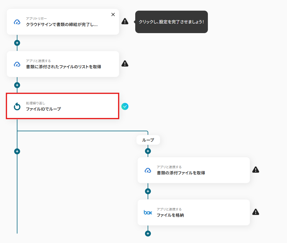 クラウドサインで取引先企業の帳票類を管理し処理しており、Boxを使用したファイル管理を自動化したい場合におすすめのフローです。