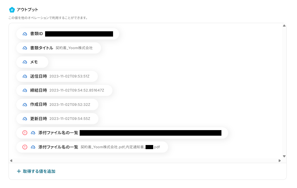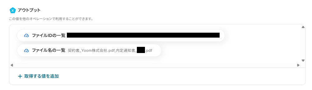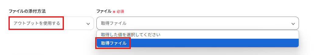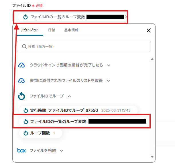 「ファイルID」は、入力欄をクリックして表示されるアウトプットから選択できます。