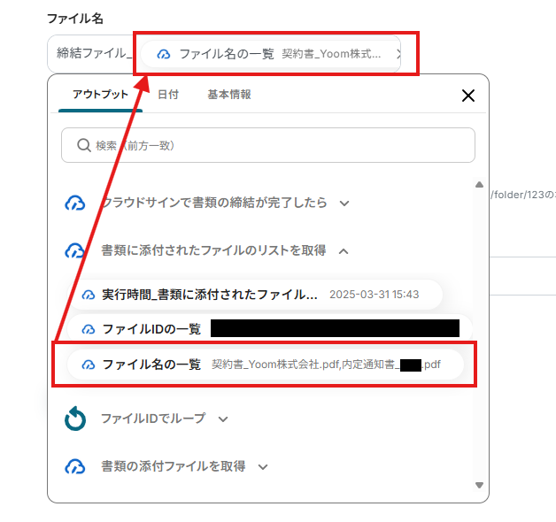 「ファイル名」は、入力欄をクリックして表示されるアウトプットから選択してください。