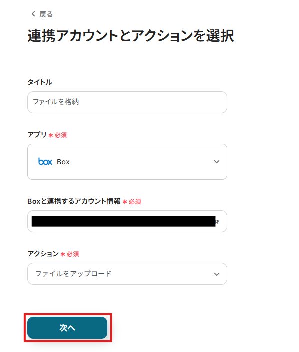 2.表示された画面で各項目を確認します。トリガーアクションはそのままにして、「次へ」をクリックしましょう。