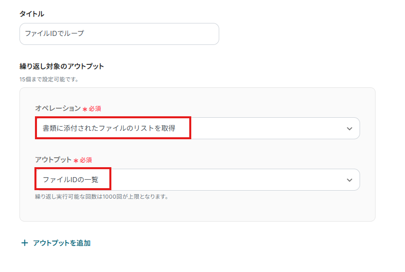 「繰り返し対象のアウトプット」は、プルダウンから選択してください。オペレーションに画像の赤枠部分、アウトプットに検知したい項目を設定します。