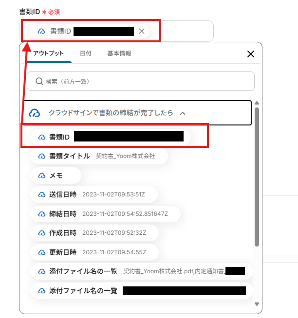「書類ID」は、入力欄をクリックして表示されるアウトプットから選択してください。