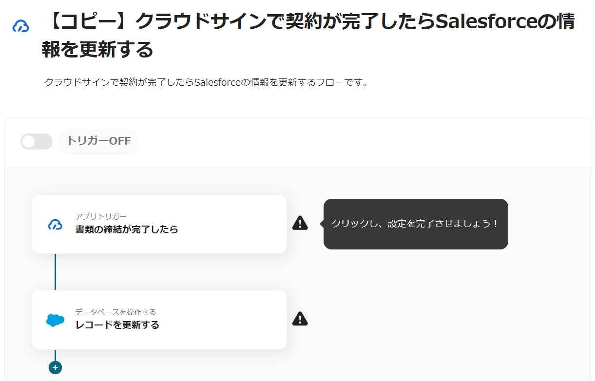 今回は「クラウドサインで契約が完了したらSalesforceの情報を更新する」という以下のテンプレートの設定方法をご紹介します。