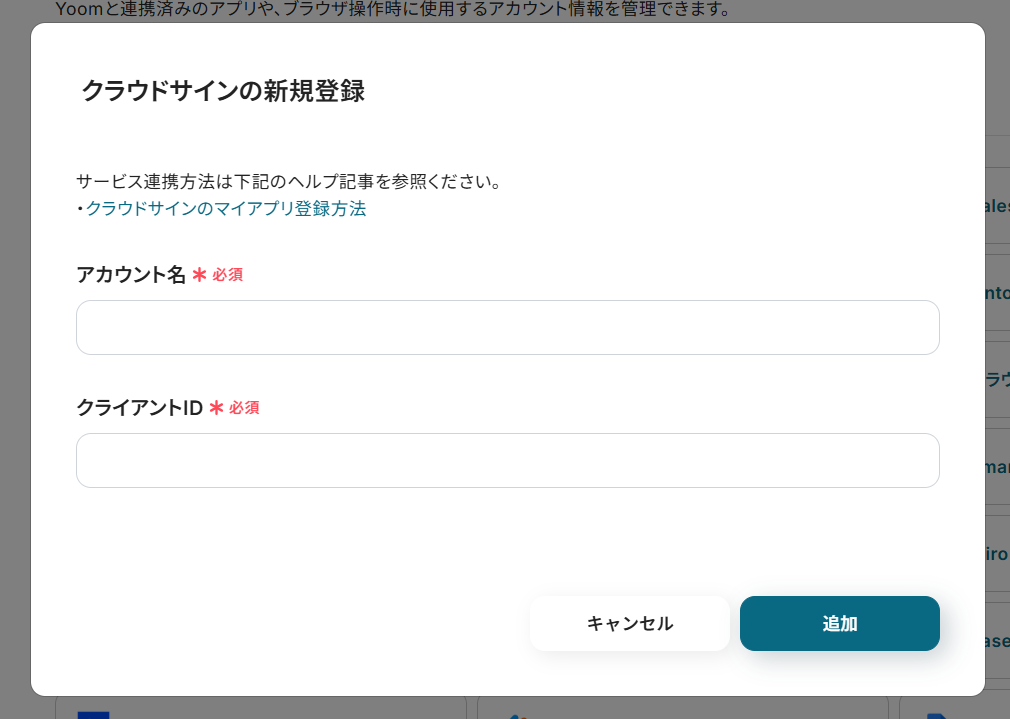 早速、クラウドサインとSalesforceをYoomに接続するマイアプリ登録を行いましょう。