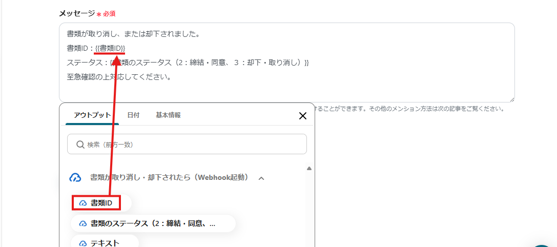 「書類が取り消し・却下されたら(Webhook起動)」アクションのあとに、「進行先を切り替える」オペレーションを追加すると、ステータスに応じて通知先やメッセージ内容を分けられます。