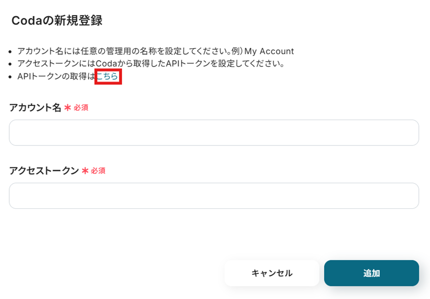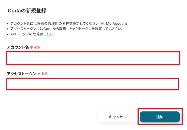 Yoomの「Codaの新規登録」画面に戻って、「アカウント名」を任意で設定し、先ほどコピーしたAPIトークンを「アクセストークン」に貼り付けて「追加」を選択しましょう。