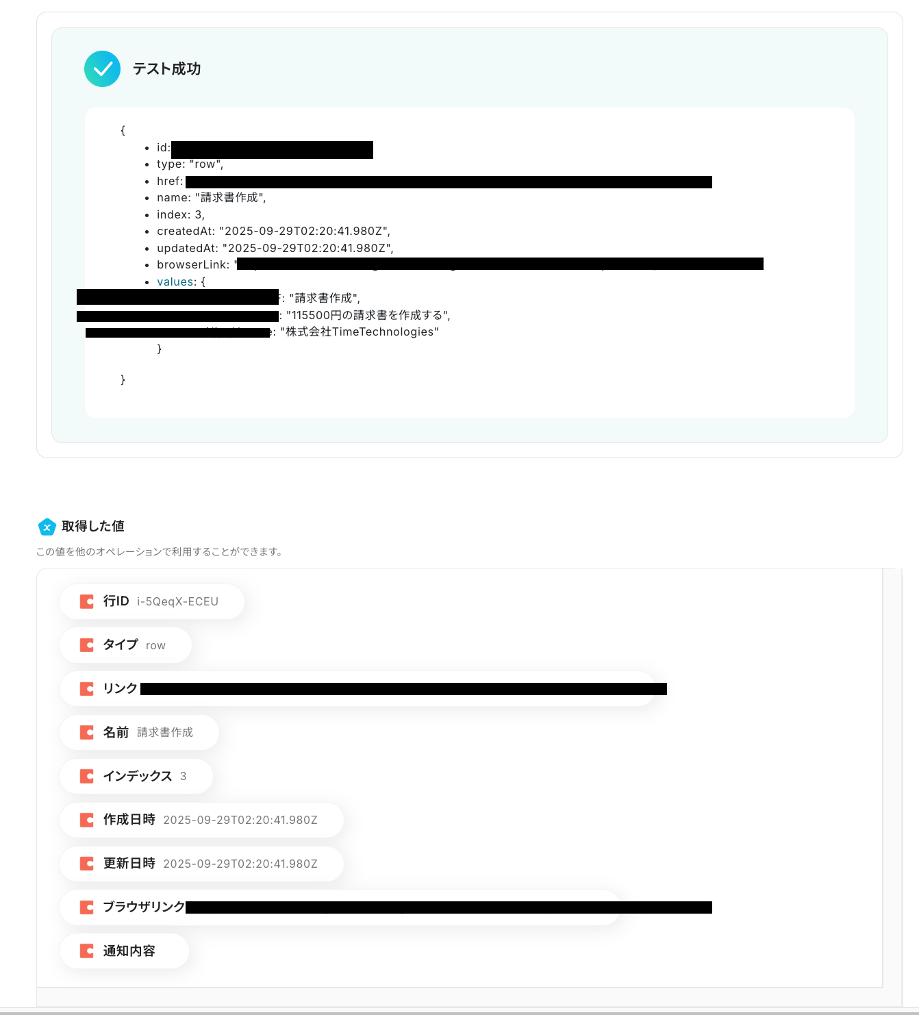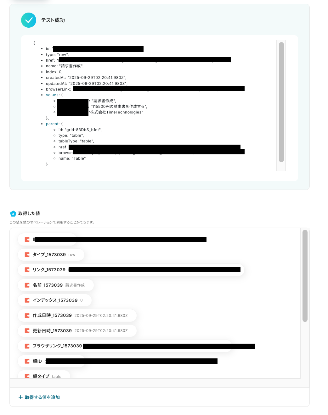 テストが成功すると取得した値が表示され、Codaのデータが確認できます。「保存する」をクリックして完了です!取得した値について、詳しくはこちらをご参照ください。