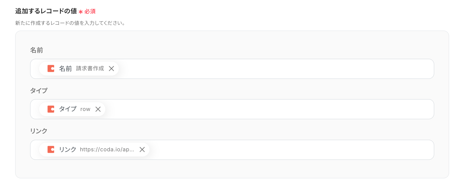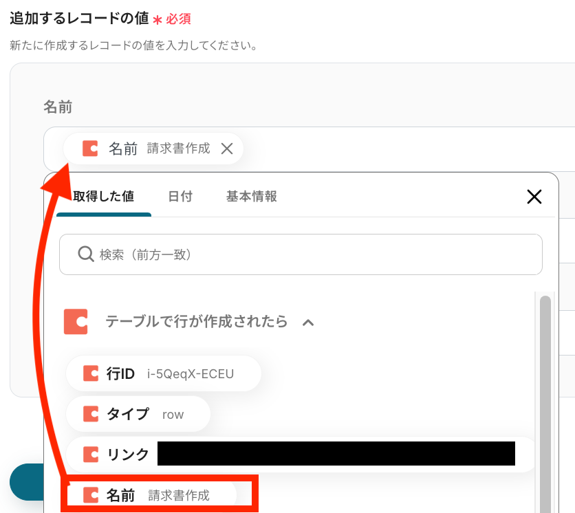 「追加するレコードの値」の各項目は、入力欄をクリックして表示される取得した値から選択してください。
