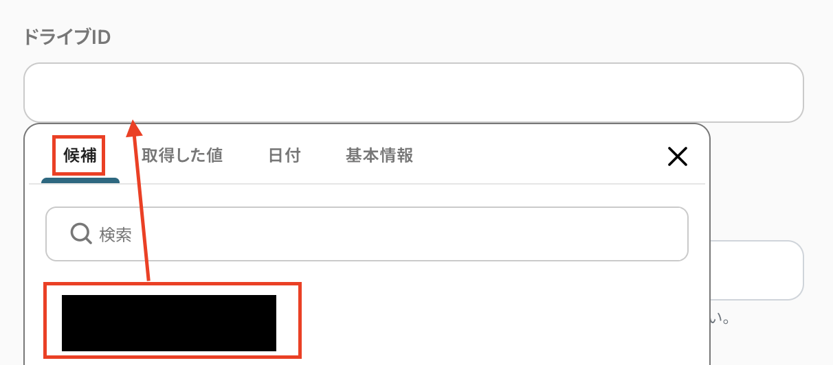 続けてドライブIDも選択します。連携しているアカウントに基づいて候補が表示されるのでクリックして選択しましょう。
