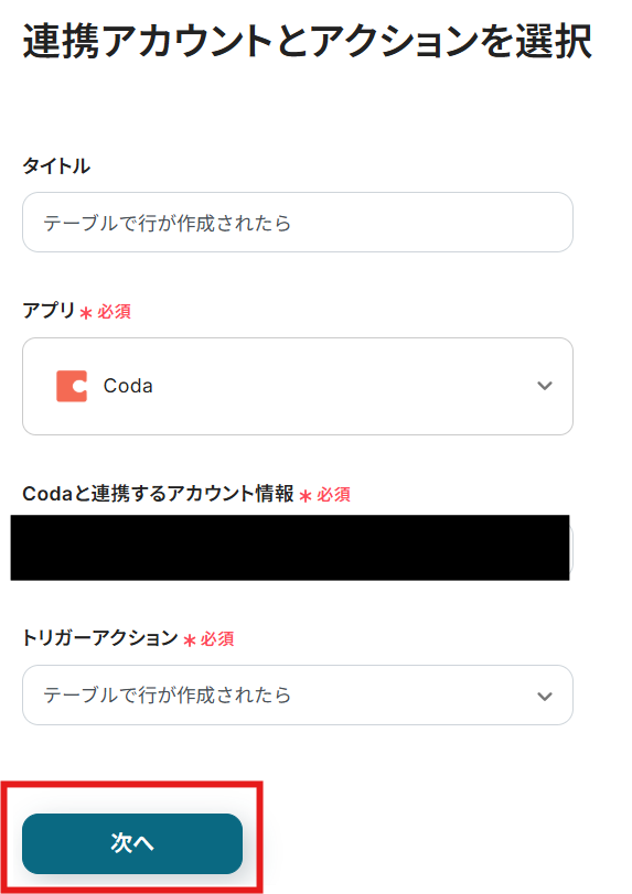タイトルと連携するアカウント情報を確認し、アクションはテンプレート通りのまま「次へ」をクリックして進んでください。