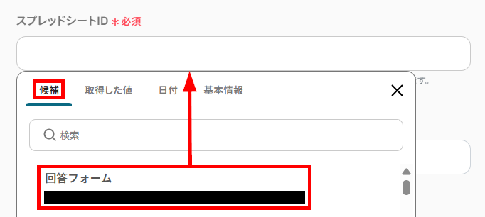 スプレッドシートIDとスプレッドシートのタブ名は、候補から設定できます。
