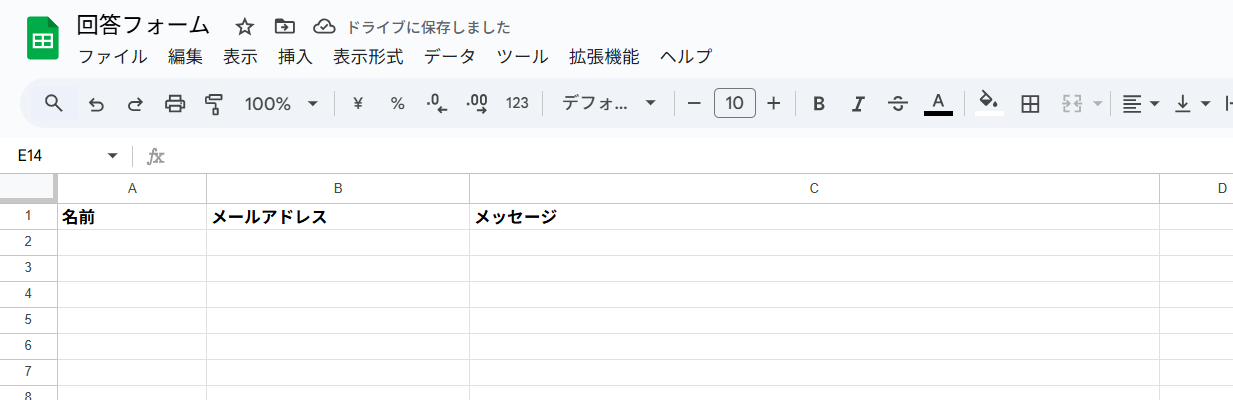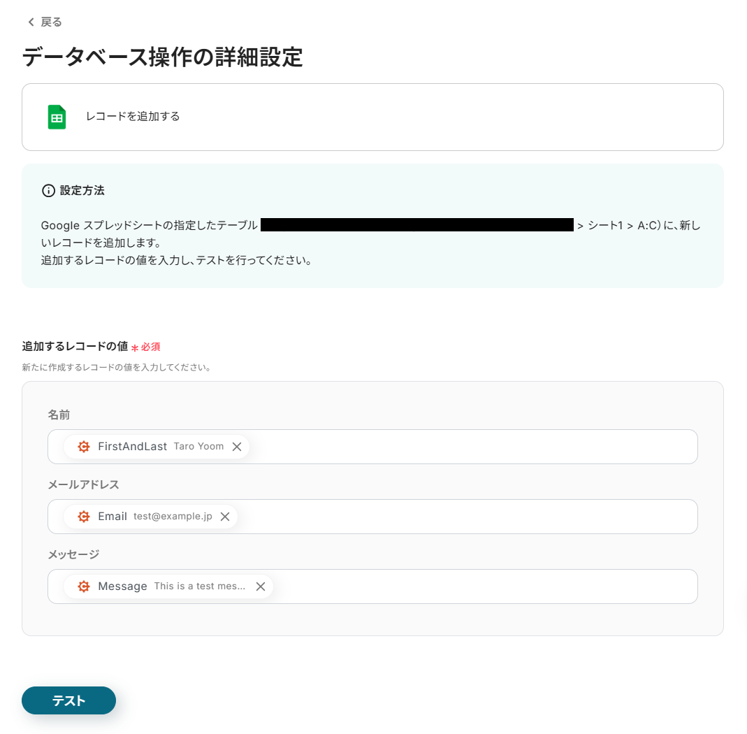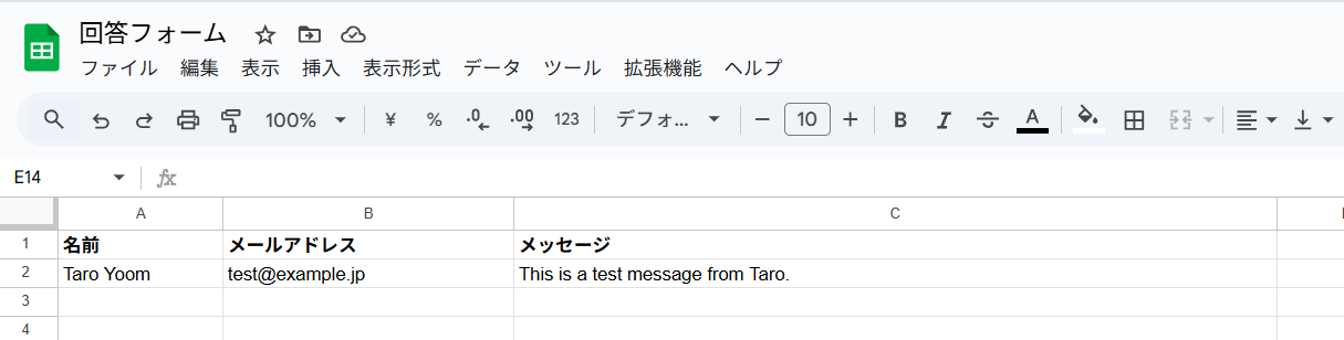 上記の設定後、テストを行いましょう。 成功すると、Google スプレッドシートに行が追加されるので確認してください。