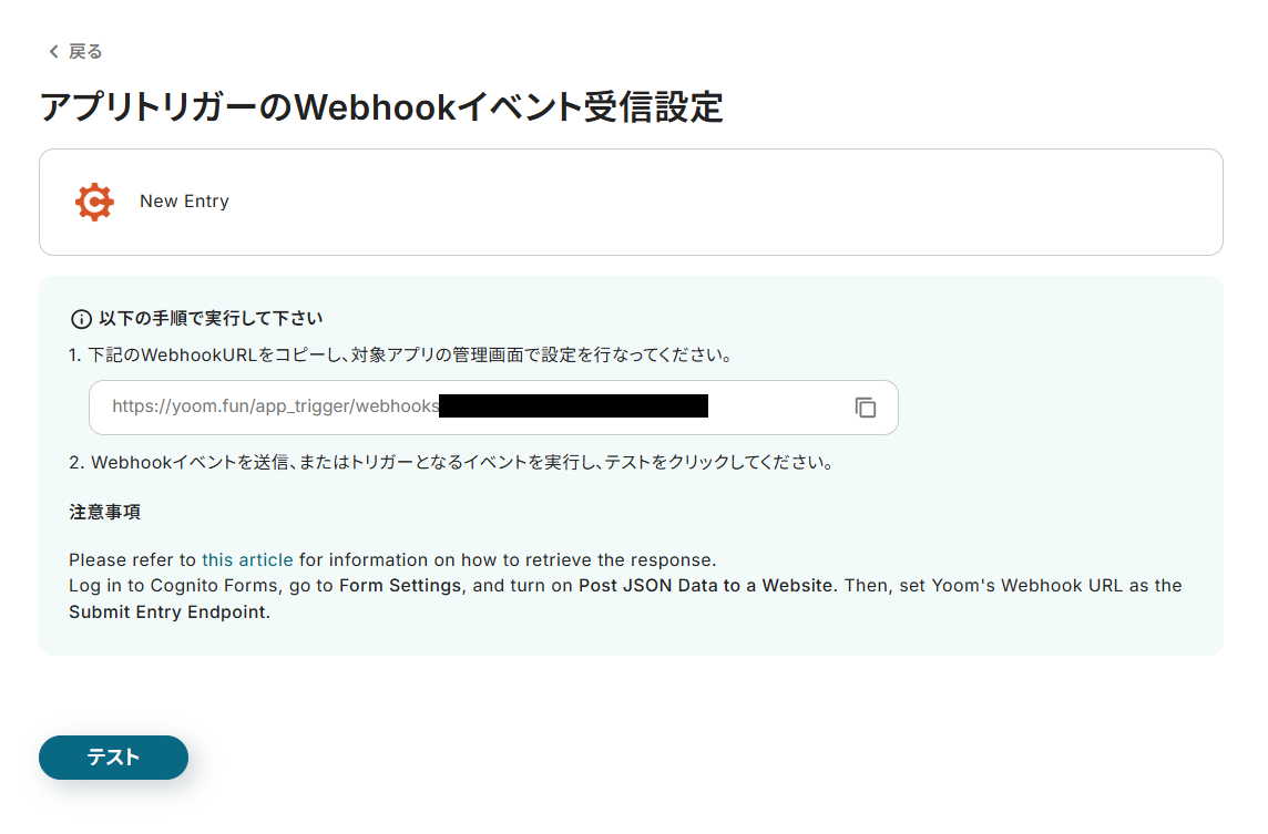 表示されているWebhookURLをコピーしたら、枠下の注記を参考にしてCognito Formsに設定してください。 WebhookURLを設定したフォームにテスト用の回答を送信してから「テスト」をクリックしましょう。