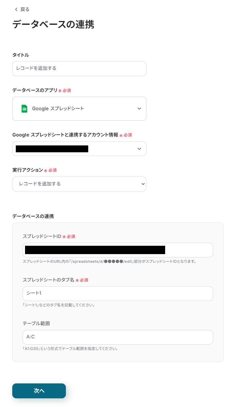 データベースの連携を設定して次へ進みます。 その他の項目は、すでに設定されています。