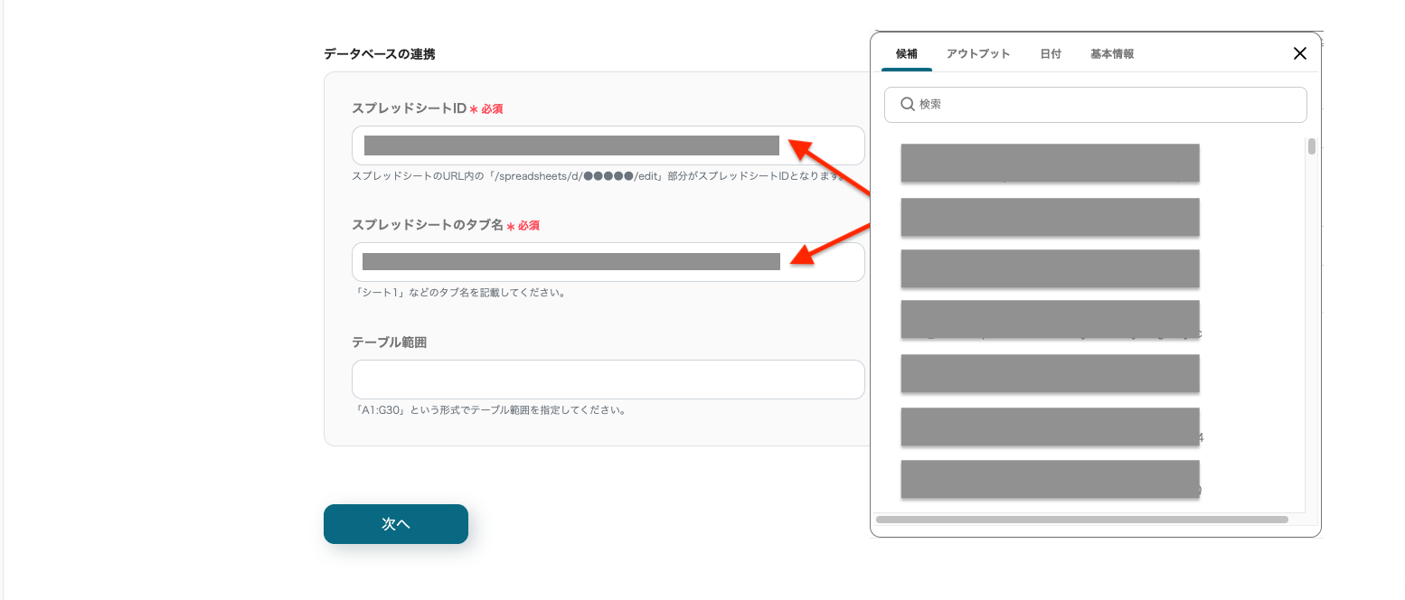 「データベースの連携」にて、スプレッドシートIDとスプレッドシートのタブ名を設定します。 入力欄をクリックすると候補が表示されるので、該当項目を選択し「次へ」をクリックしてください。