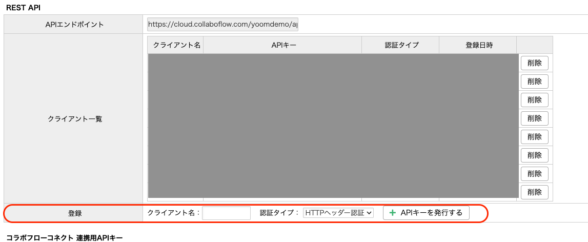 画面を下にスクロールし、「REST API」の「登録」からAPIキーを発行します。