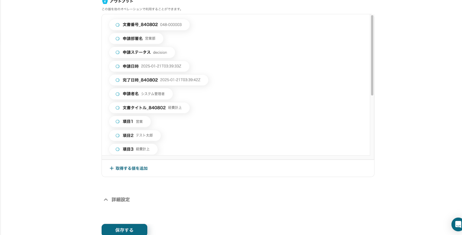 テストに成功すると、以下のように「アウトプット(取得した値) 」が表示されます。