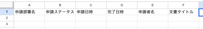 Google スプレッドシートにコラボフローのデータを追加するため、取得した値の項目をもとに画像のようなシートを作成しました。